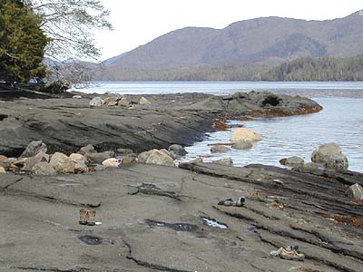 Here are the rocks in front of the seaweed cabin. The seaweed is collected from the water and dried on the rocks. It's then consumed by some in the community or sold on the open market.