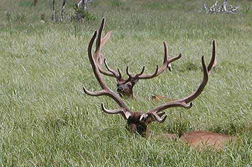 This is two of three bull elk with beautiful velvet antlers trying to stay cool in tall grass by the road. We watched for 15 minutes and they hardly moved. One stood for a moment, decided it too hot, and sat back down.