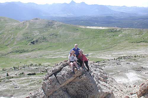 Sam and two colleagues, Jennifer and Denise, on rocks at the top of the butte. The view is to the West and into Yellowstone National Park.