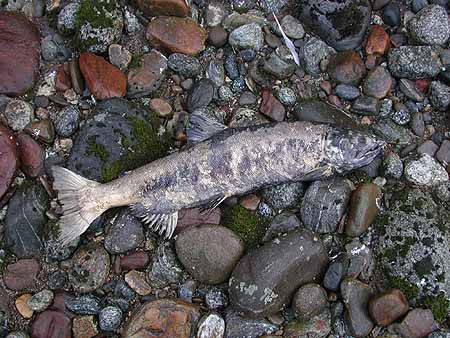 The river was thick with spawning chum and pink salmon. Many more were dead along the river's edge, or had been carried into the forest by bears.