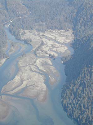 This is the mouth of the Khutze (pronounced coots) River. It's a big salmon river. In the fall, the grass flats seen here can be full of bears gorging on salmon before winter.