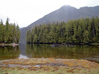 near fresh water streams that empty into the salt water. The wolves catch salmon from these streams in the fall. They are such habitual animals that