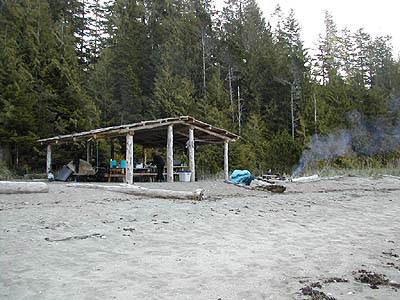 A small camp for Heiltsuk youth was built at Koeye. This beach is the center of it. Behind the shelter are a few small cabins where the kids sleep during their summer stay.