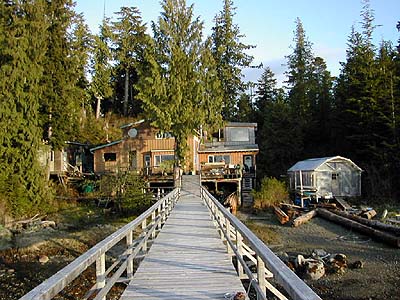 Ian and Karen's house on a beautiful Bella Bella day. They actually live on Shearwater, a small island just off Bella Bella. So their method of commuting is motor boat.