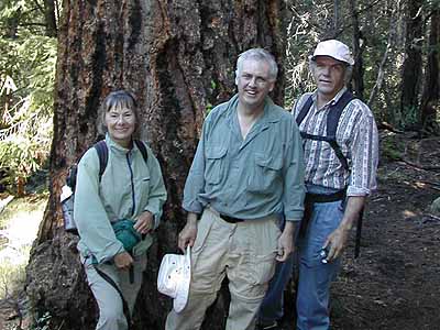Dona Reel, Ric Careless, and Dave Neads standing in front of a giant interior Douglas Fir. Ric and Dona, as mentioned