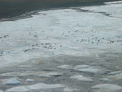 Caribou on ice. The Arctic is known for its swarms of mosquitoes. Caribou, some of which migrate to the coastal plain in the summer to bear calves, seek ice patches like these to avoid mosquitoes.