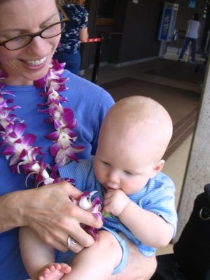 Lindsey and Finley arriving at the Kauai airport. This was Lindsey's first solo flight with Finley. Fortunately she was aided by some nice folks from Scotland who provided an extra set of hands.