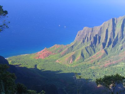 A view of the Na Pali coast from above. Due to all of the rains and fog that linger in this valley, such a clear view is a rare treat. The Na Pali coast is the site for filming of Jurassic Park. It is possible to hike in, though most folks see it by helicopter or boat.
